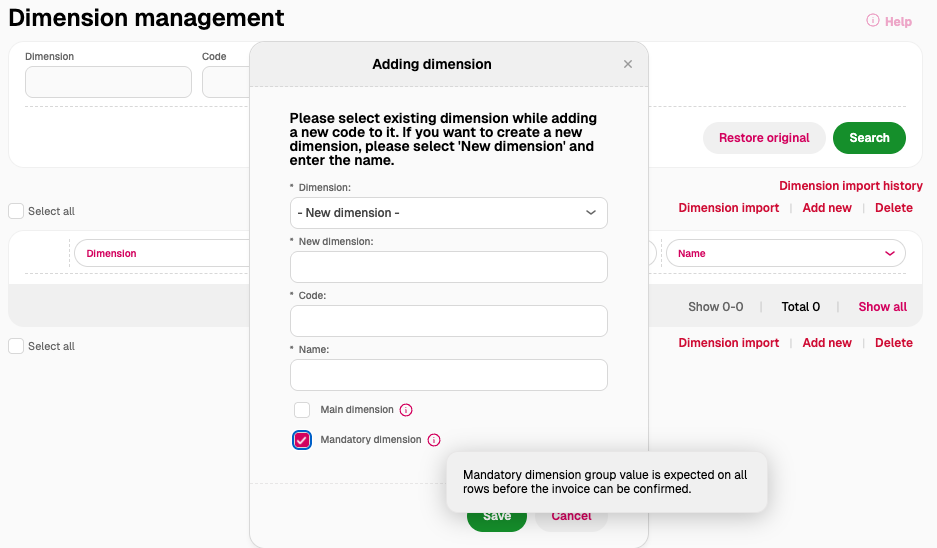 To help prevent mistakes in accounting, you can now set a mandatory dimension for invoice lines. This means that when approving an invoice, each line must have the required dimension filled in when adding accounting information.