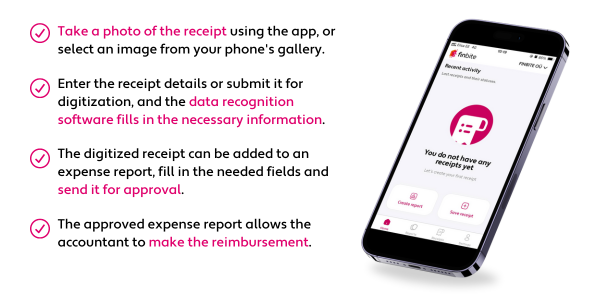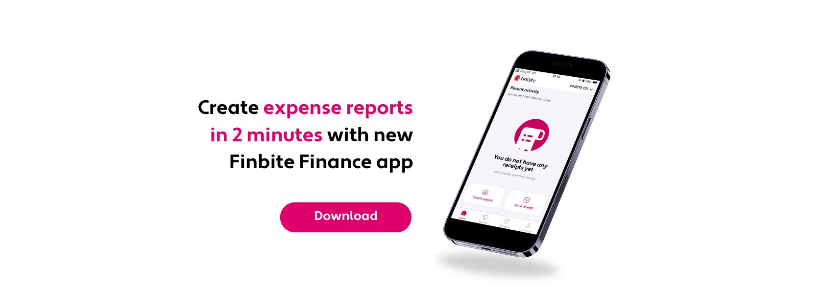 Finbite Finance, the new mobile application for filing expense reports, allows you to take a picture of a receipt immediately after purchase and enter it as an expense report into your company’s invoicing environment. With the new app, there is no need to collect paper receipts, deliver them to your accountant, sort and store them, as the whole process is digital. As a result, the sum shown on the expense report reaches the submitter’s bank account 6 times faster than with a paper-based system.