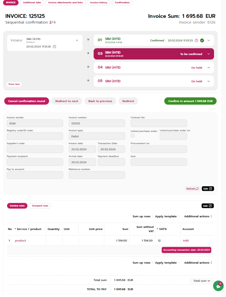 - Jei nustatyta riba yra mažesnė, sąskaita faktūra bus nukreipta kitam šablone nustatytam tvirtintojui.