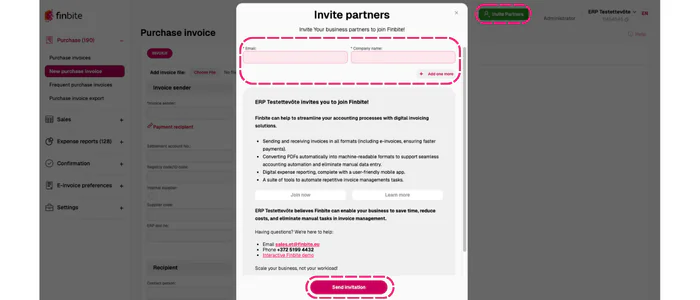 Jūs galite tiesiogiai iš „Finbite“ platformos išsiųsti draugišką kvietimą tiekėjui ar partnerių įmonei prisijungti prie „Finbite“. Tai supaprastina jūsų partnerių prisijungimo procesą ir padeda pakeisti PDF sąskaitas struktūrizuotomis ir automatizuotomis e. sąskaitomis.