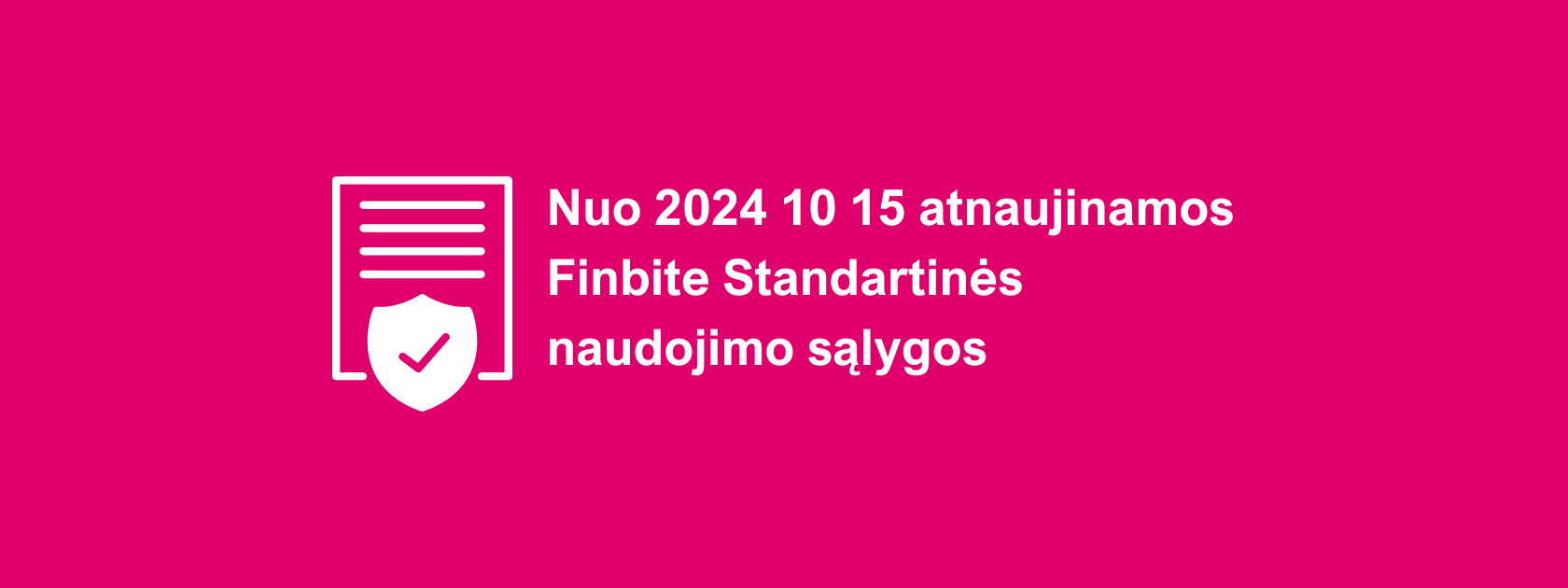 Nuo 2024-10-15 įsigalios naujos „Finbite“ Standartinės naudojimo sąlygos. Dabartiniai vartotojai nebus paveikti. Naudojimo sąlygų pakeitimai daugiausia susiję su nauja savitarnos aplinka, kurioje nauji vartotojai/įmonės gali prisijungti prie „Finbite“. Taip pat patikslinome skaitmeninimo paslaugos sąlygų formuluotes.