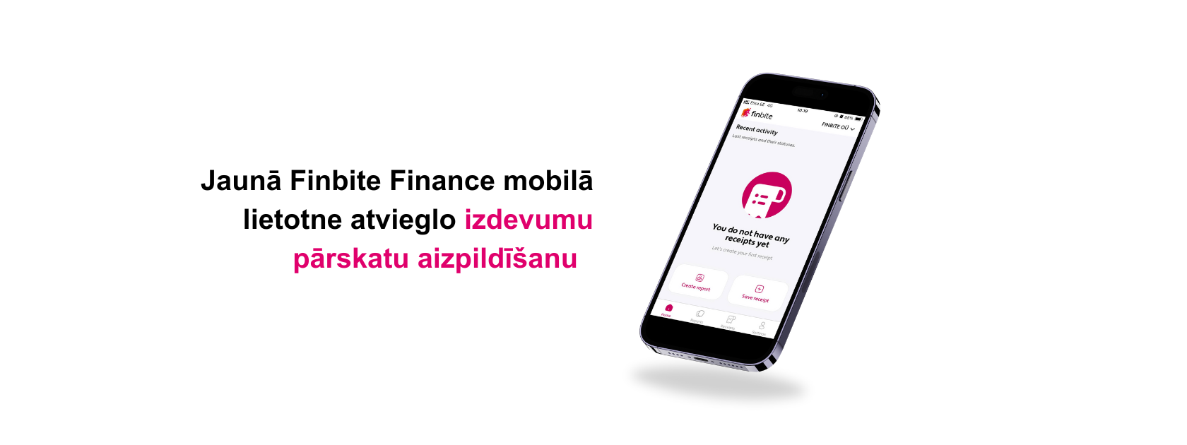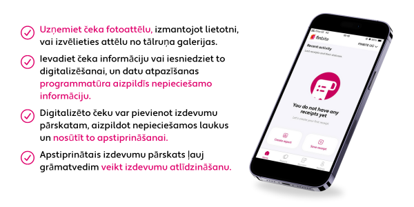 Finbite Finance, jaunā mobilā lietojumprogramma izdevumu pārskatu aizpildīšanai, ļauj nofotografēt čeku uzreiz pēc pirkuma un ievadīt to kā izdevumu pārskatu uzņēmuma rēķinu sagatavošanas vidē. Izmantojot jauno lietotni, nav nepieciešams vākt papīra kvītis, nogādāt tās grāmatvedim, šķirot un uzglabāt, jo viss process notiek digitāli. Rezultātā izdevumu pārskatā uzrādītā summa iesniedzēja bankas kontā nonāk 6 reizes ātrāk nekā papīra formātā.