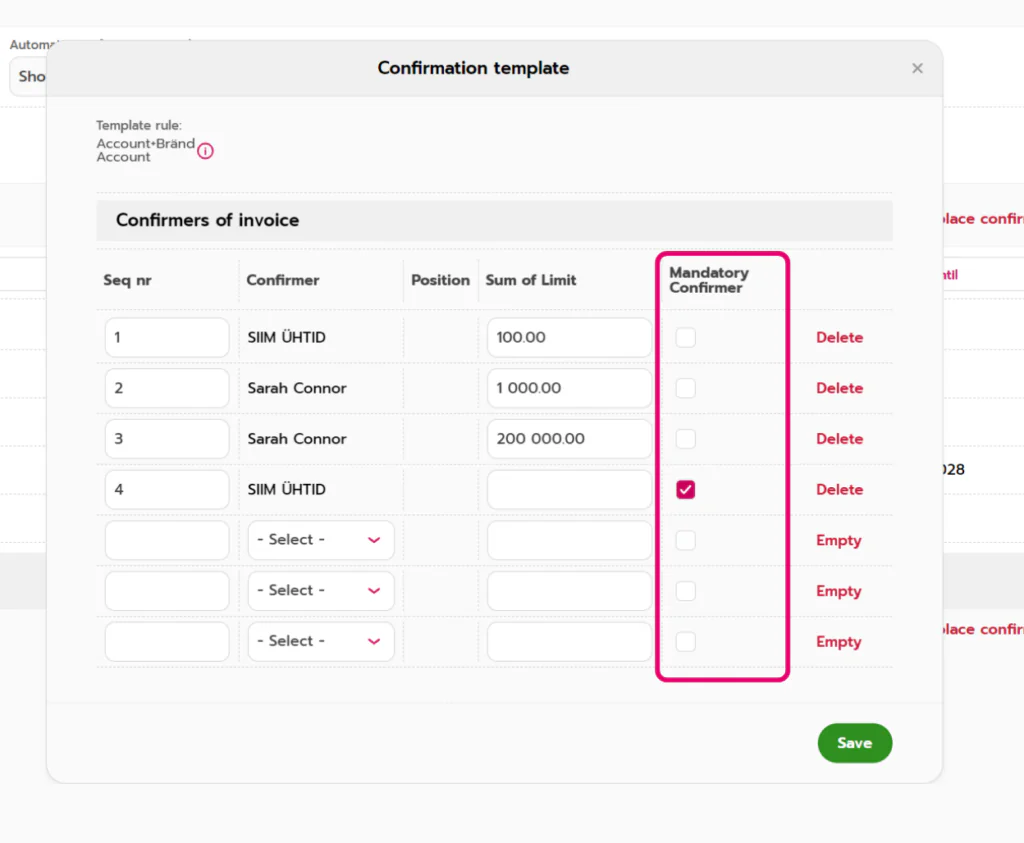 - Теперь вы можете задать обязательных подтверждающих, которые должны всегда подтверждать счет, независимо от ограничений предыдущих подтверждающих. Например, если бухгалтер должен проверять и подтверждать счета, вы можете установить его в качестве обязательного подтверждающего лица и гарантировать, что он всегда будет участвовать в процессе. Это нововведение делает использование кругов подтверждения, шаблонов подтверждения и пользовательских ограничений гораздо более гибким.